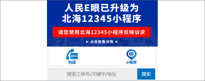 微信里面打开小程序,然后搜索“北海12345”。它以前叫“人民E眼”,现在升级为“北海12345”,它是北海市的咨询平台和投诉平台。