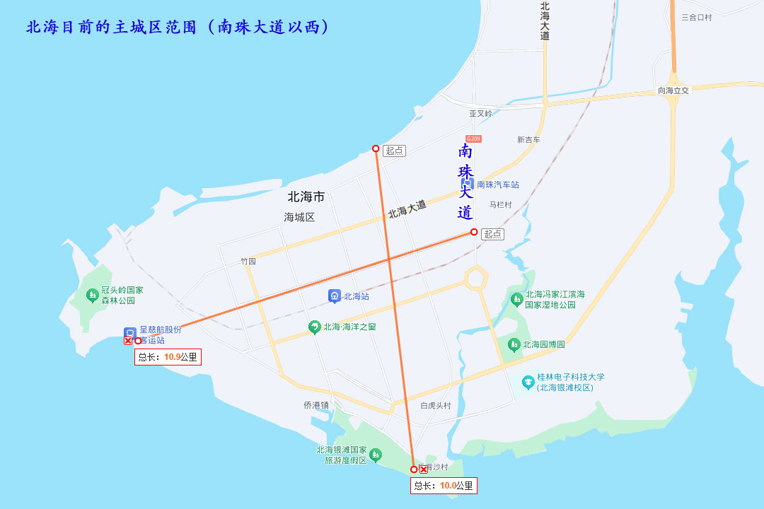 北海的主城区很小:南北最宽10公里、东西最长10.9公里(不含冠头岭)。