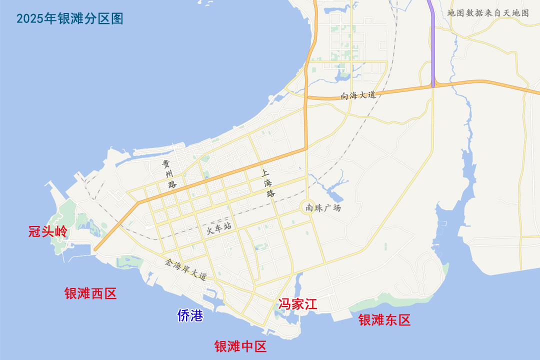 北海银滩从西向东共分6个区域:冠头岭、银滩西区、侨港镇、银滩中区、冯家江、银滩东区。
