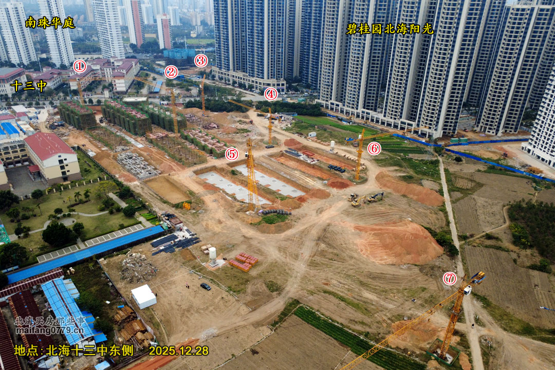 位于南珠大道北海十三中东侧的一个楼盘工地,一口气耸立了7座塔吊: