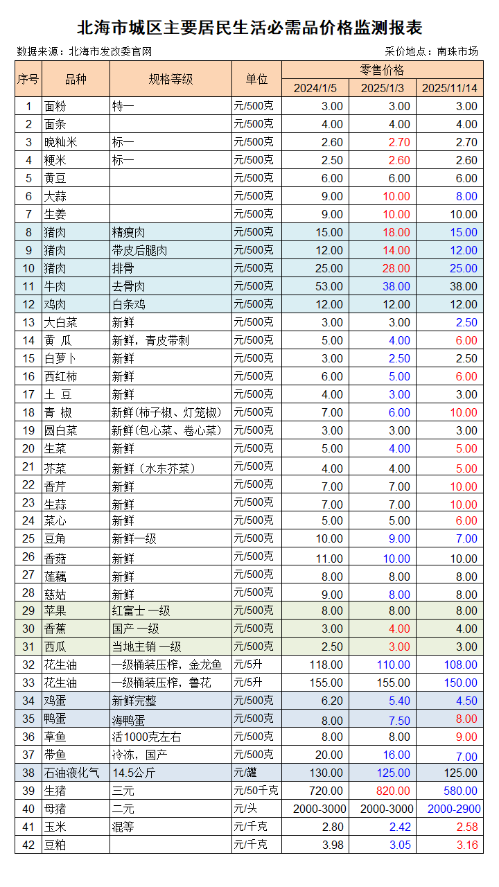 关于北海的物价,北海市发改委差不多每周都有一份监测报告,数据全部公开在其官网(首页->专题专栏-> "菜篮子"产品价格监测)。