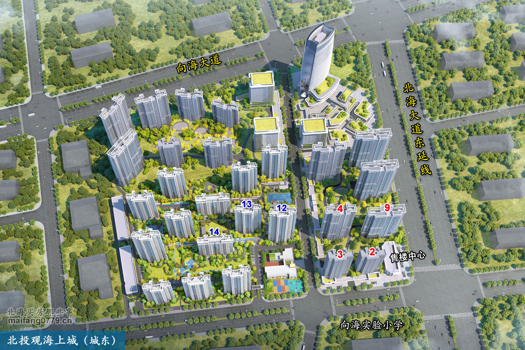 北投观海上城,位于向海大道与北海大道东延线交汇处西南角,一期南门正对海城区向海实验小学。