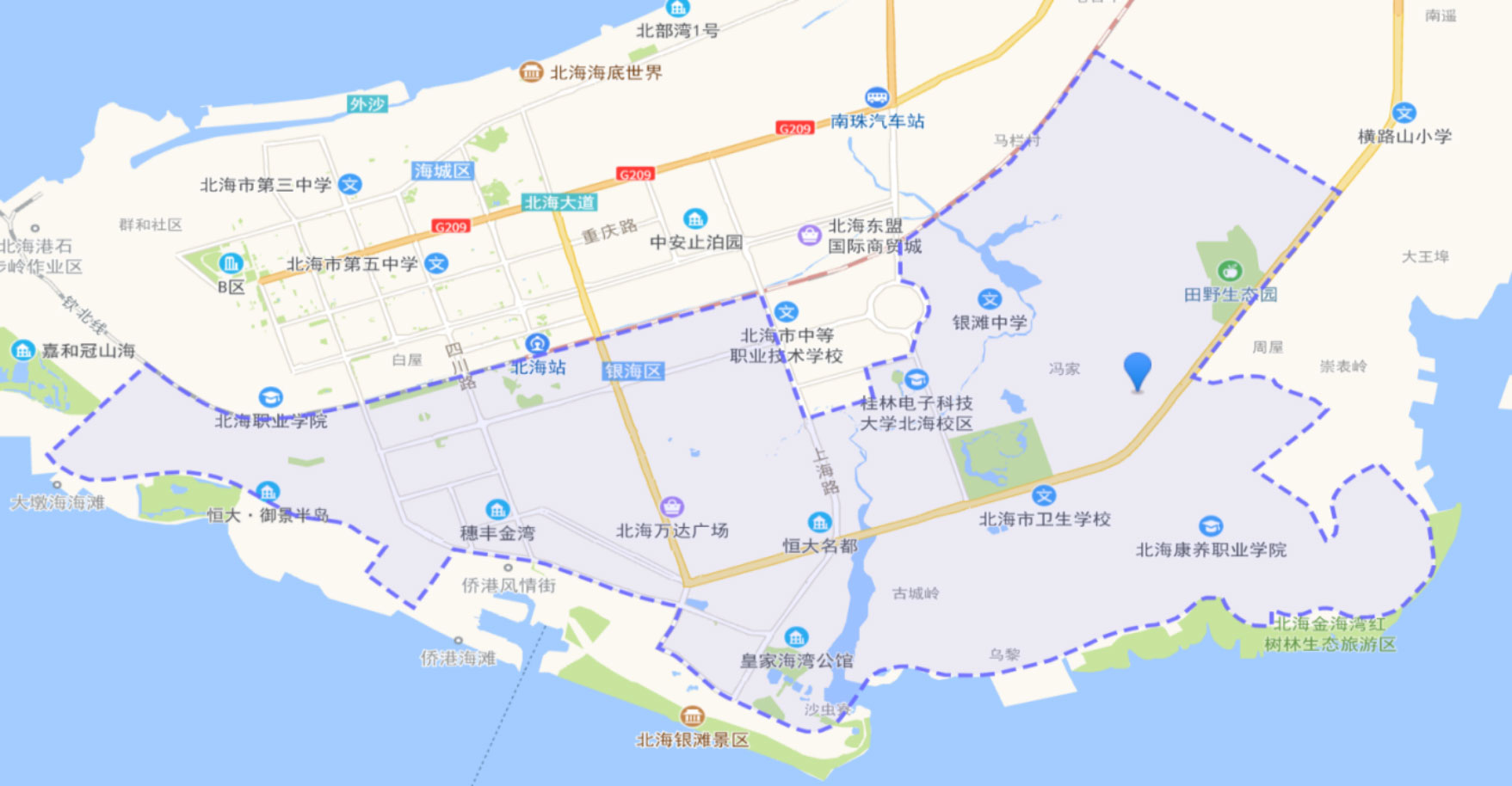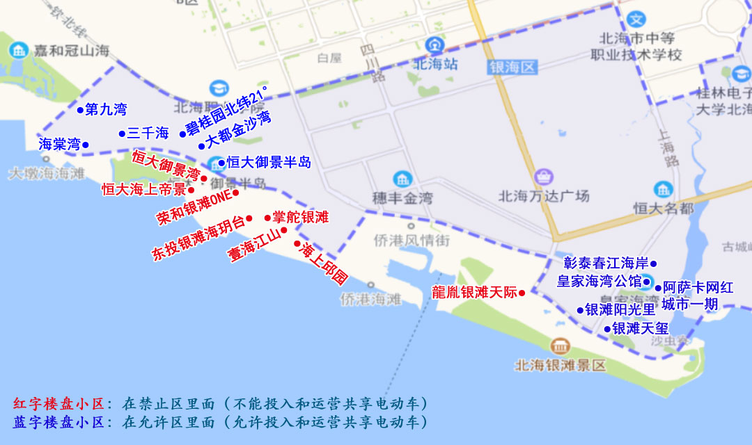 以银海区为例:上图蓝色虚线范围围合的区域内,相关运营企业可依法依规开展共享电动自行车运营活动;蓝色虚线范围外(不含海城区),禁止共享电动自行车投放及运营。