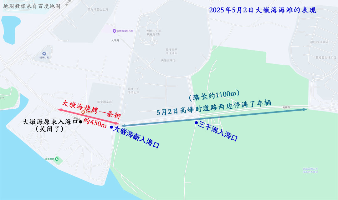 大墩海海滩的入海口,后来向东转移到与三千海交界处。结果今年五一很有趣——那儿的烧烤点、水果摊等等自动延长了好几百米,直接形成了很有规模的夜市一条街。