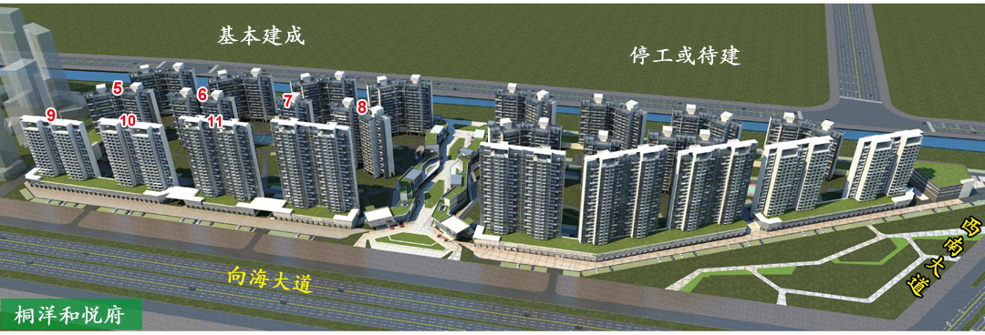 桐洋和悦府、桐洋珑悦府也是一对邻居和兄弟楼盘,位于向海大道与西南大道交汇处。标有楼号的楼栋已经建成。