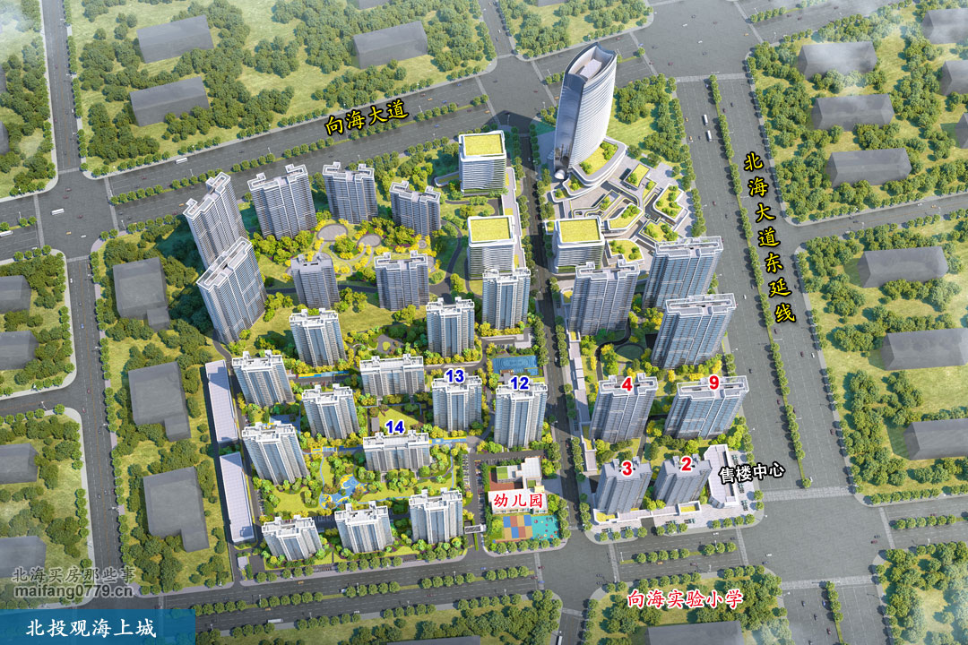北投观海上城,位于向海大道与北海大道东延线交汇处西南角。小区南门正对海城区向海实验小学。