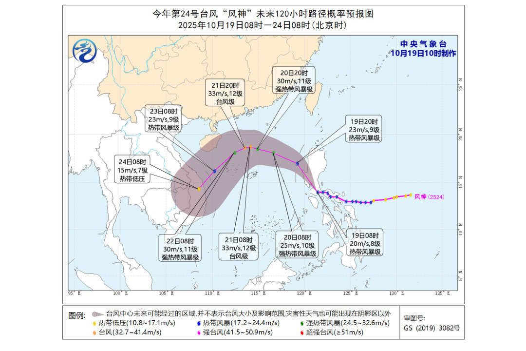 2025年名字最牛的第24号台风“风神”,今天(10月19日)风力将加大到9级,后天或扩大到12级: