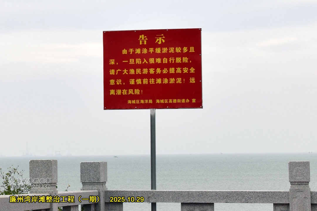 今年元旦就宣布开工的廉州湾岸滩整治工程(一期),施工进度不尽人意。现在不但没有见到海滩新鲜出炉,官方还特意竖起了警告牌:由于滩涂平缓淤泥较多且深,一旦陷入很难自行脱险,请广大渔民游客务必提高安全意识,谨慎前往滩涂淤泥!