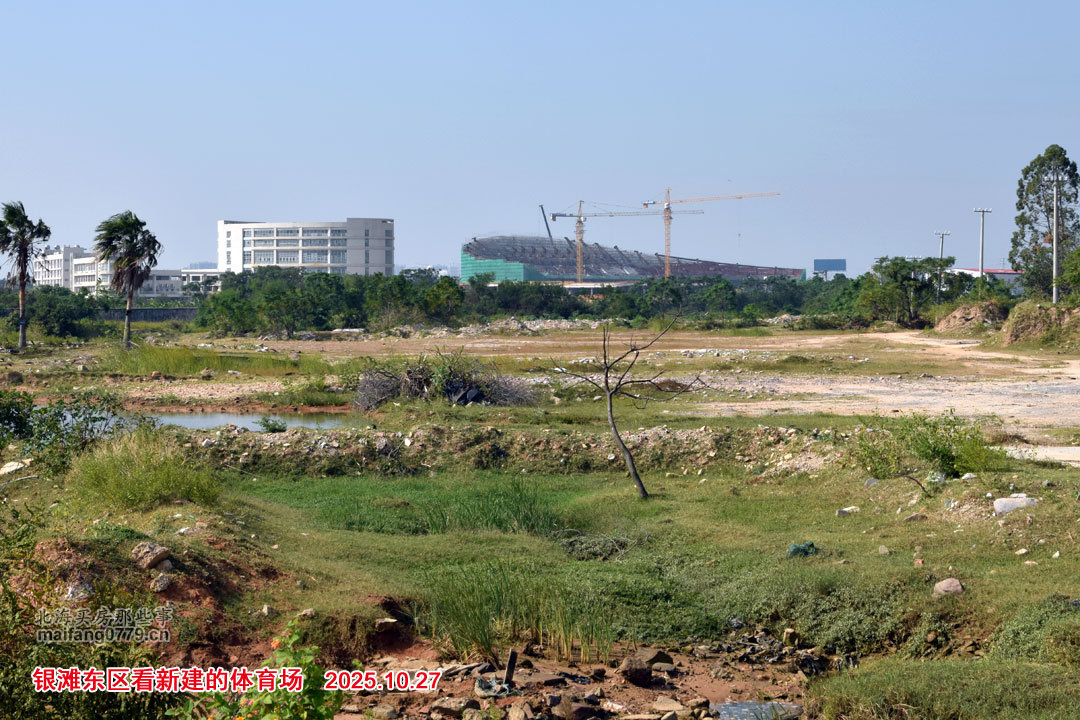 这是雅居乐金海湾小区的金海岸大道入口处那儿看到的。远处施工的就是“东盟(北海)体育实训基地”主体育场。