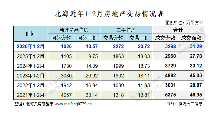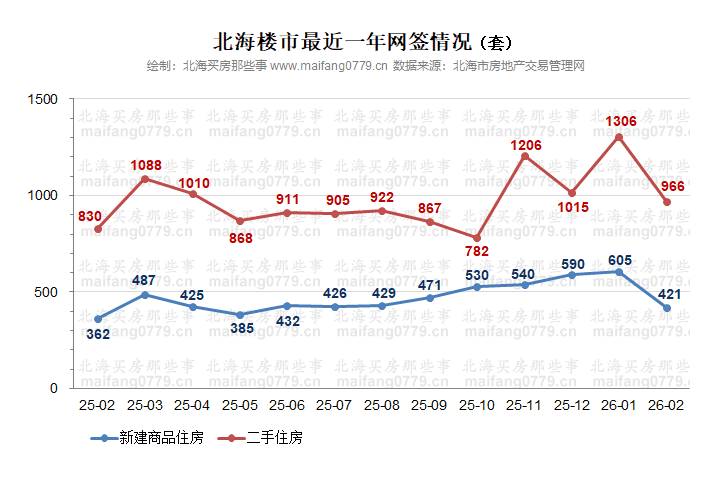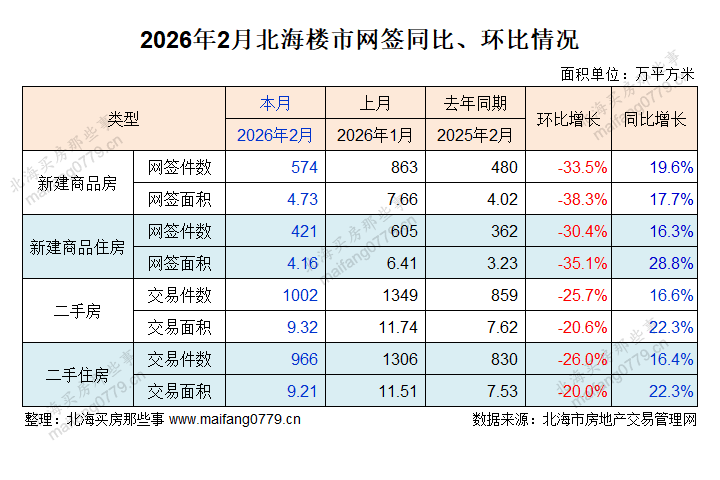 来自官方的数据:2026年2月,我市(不含合浦县)新房(新建商品住房)共网签421套、4.16万平方米;二手房(二手住房)共网签966套、9.21万平方米。