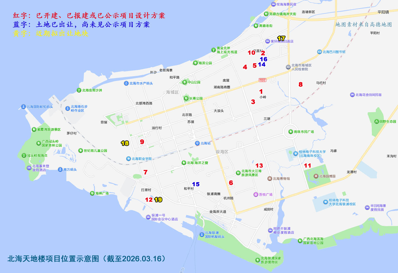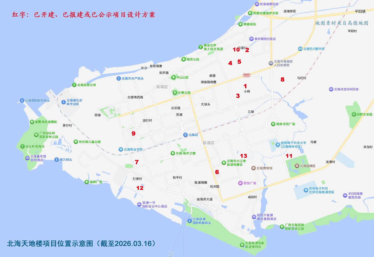 截至昨天(2026年3月16日),北海新建天地楼项目已经出现了13个:
