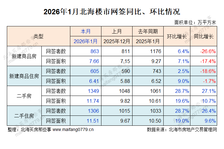来自官方的数据:2026年1月,我市(不含合浦县)新房(新建商品住房)共网签605套、6.41万平方米;二手房(二手住房)共网签1306套、11.51万平方米。